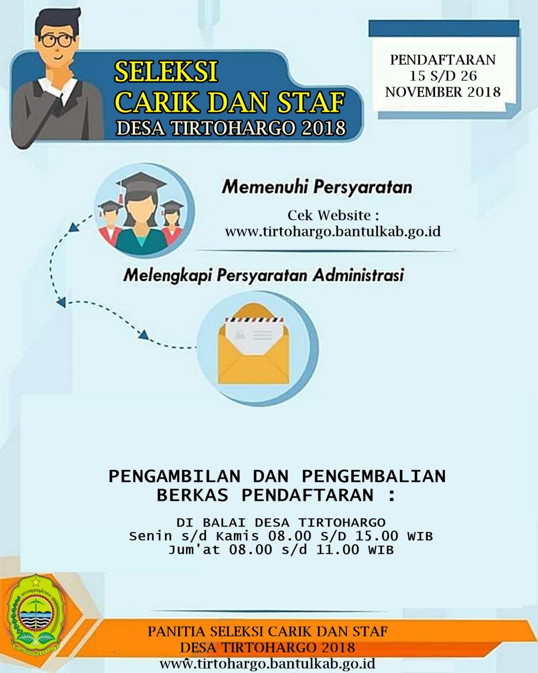Dengan ini diumumkan bahwa Pemerintah Desa Tirtohargo membuka kesempatan kepada seluruh warga yang memenuhi syarat untuk mengabdi sebagai pamong desa dalam jabatan :
